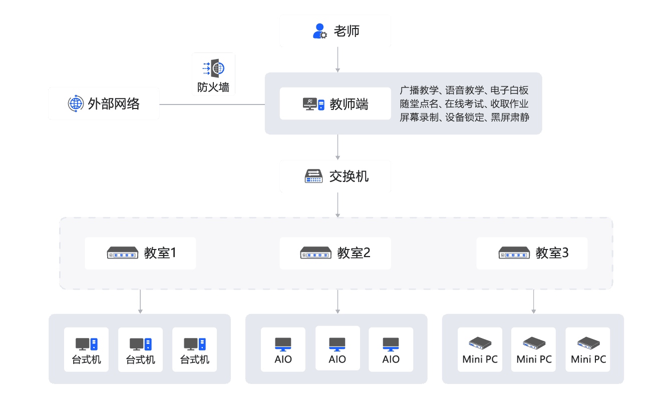 支持多个班级、多个主控端(教师机)同时上课,可进行分组教学。